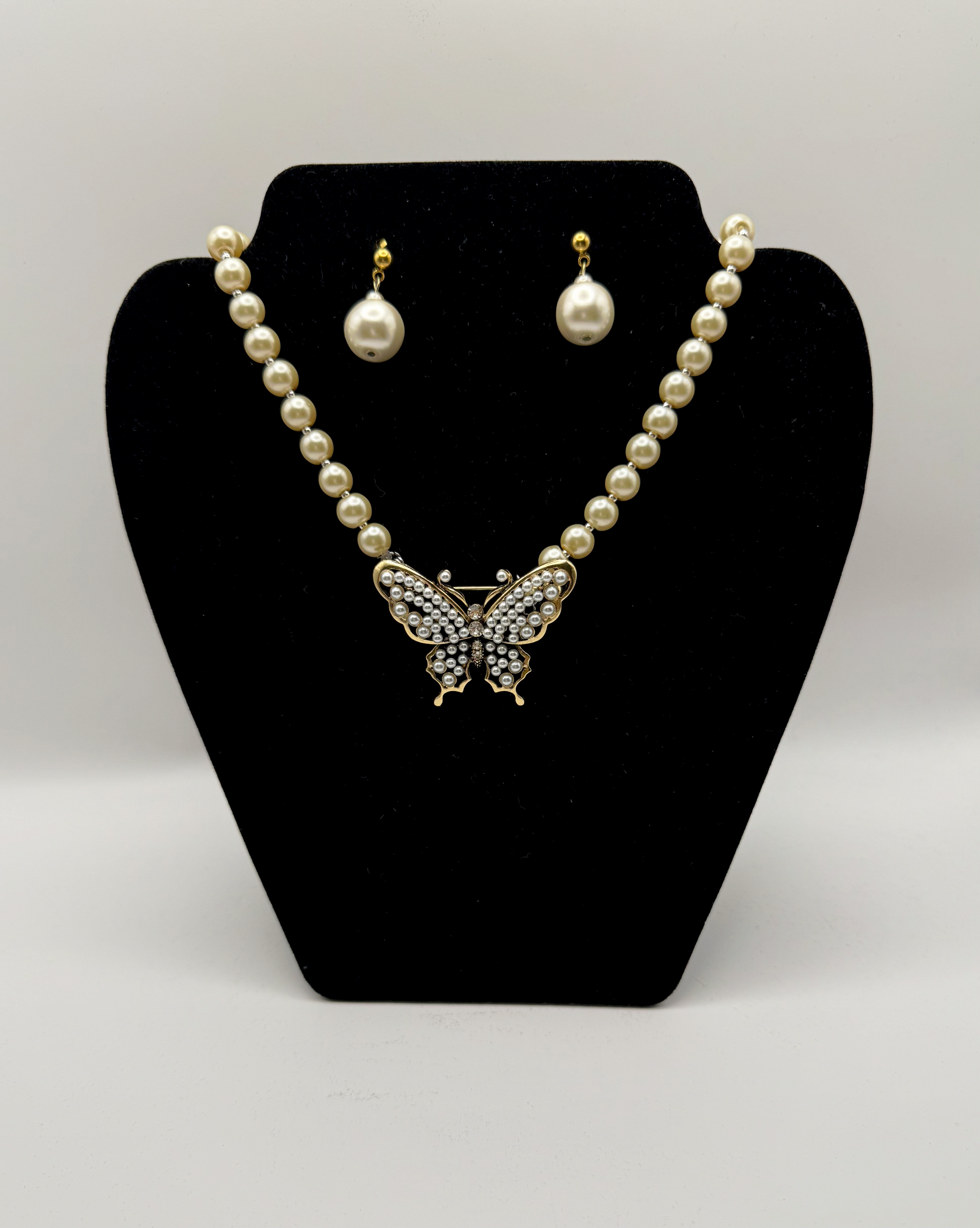 Luminous pearls frame a crystal-encrusted butterfly centerpiece, blending classic grace with a touch of whimsy. The matching pearl earrings complete this handcrafted set, perfect for adding delicate sophistication to any occasion.