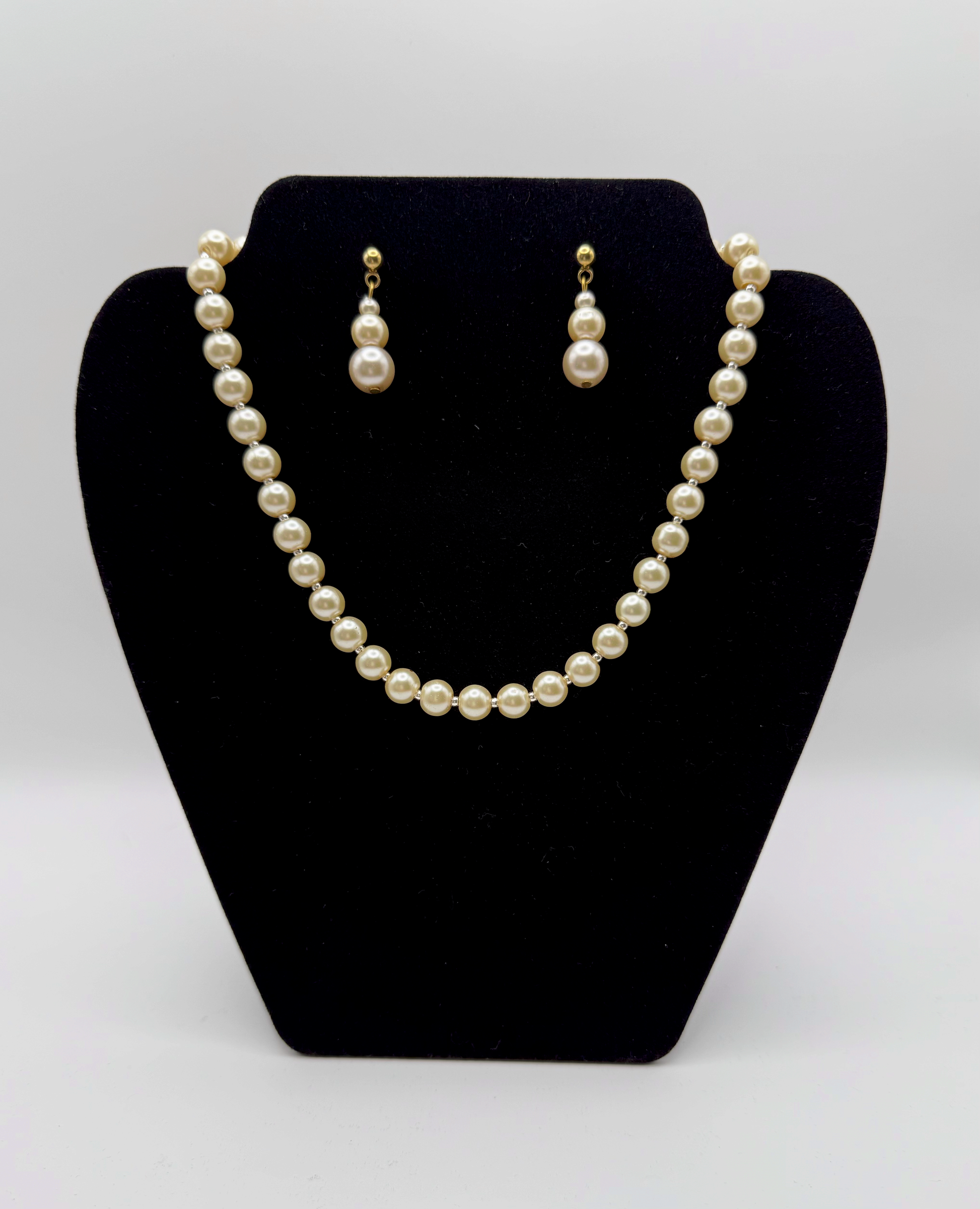 Lustrous cream pearls form a timeless single-strand necklace complemented by elegant double-drop pearl earrings. Handcrafted with gold accents, this set adds a refined touch to both formal and everyday ensembles.