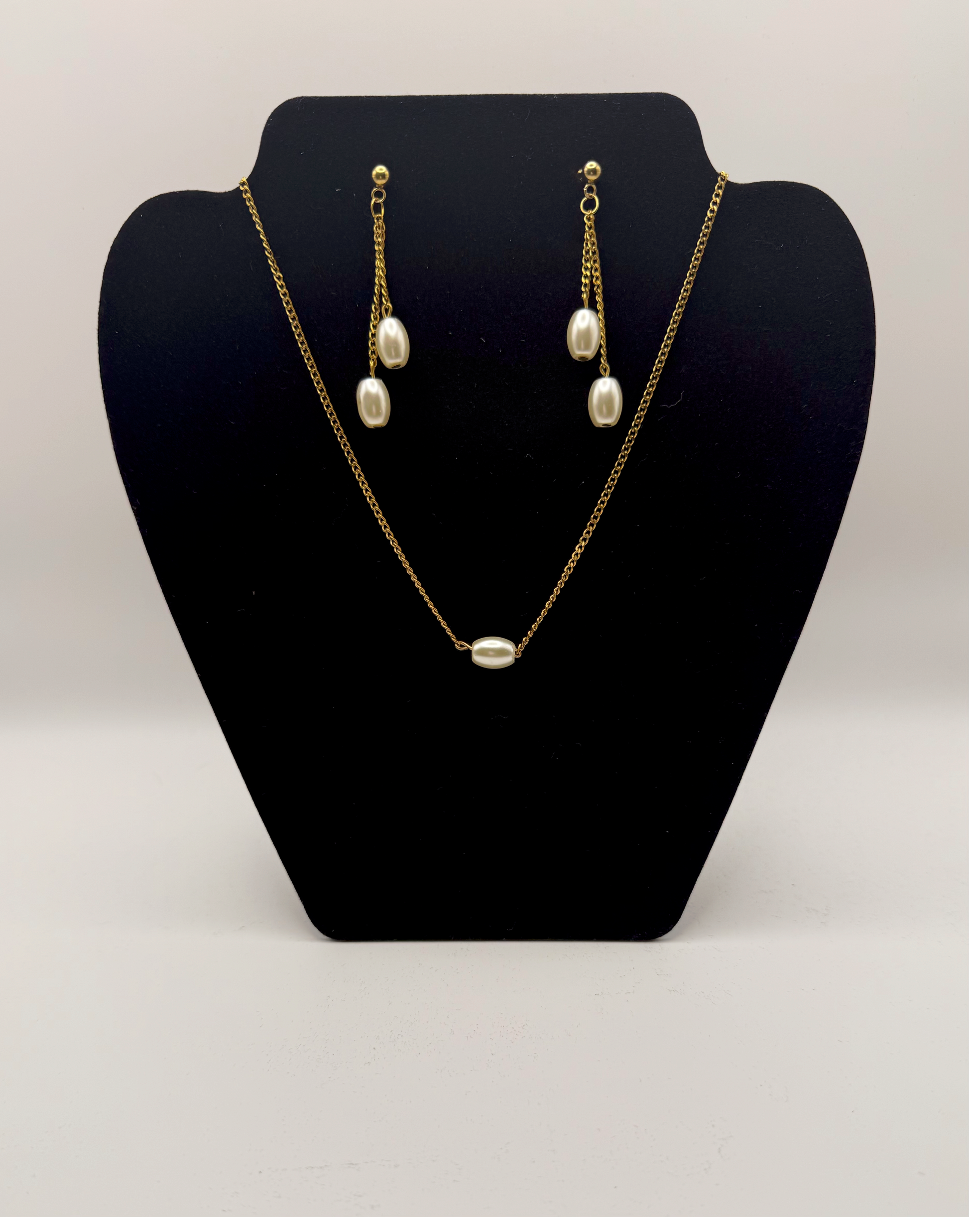 A minimalist gold chain highlights a single oval pearl centerpiece, paired with cascading pearl drop earrings for a soft, graceful movement. This handcrafted set exudes effortless elegance, perfect for formal occasions or sophisticated daily wear.