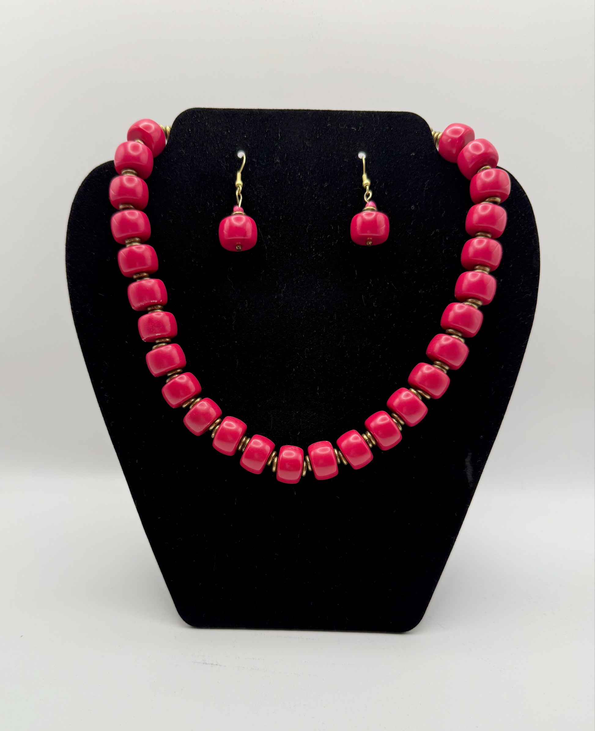 Vibrant rose-pink cube beads create a playful yet refined design with subtle golden spacers. The matching earrings echo the necklace’s cheerful tone, making this handcrafted set perfect for adding a lively pop of color to any outfit.