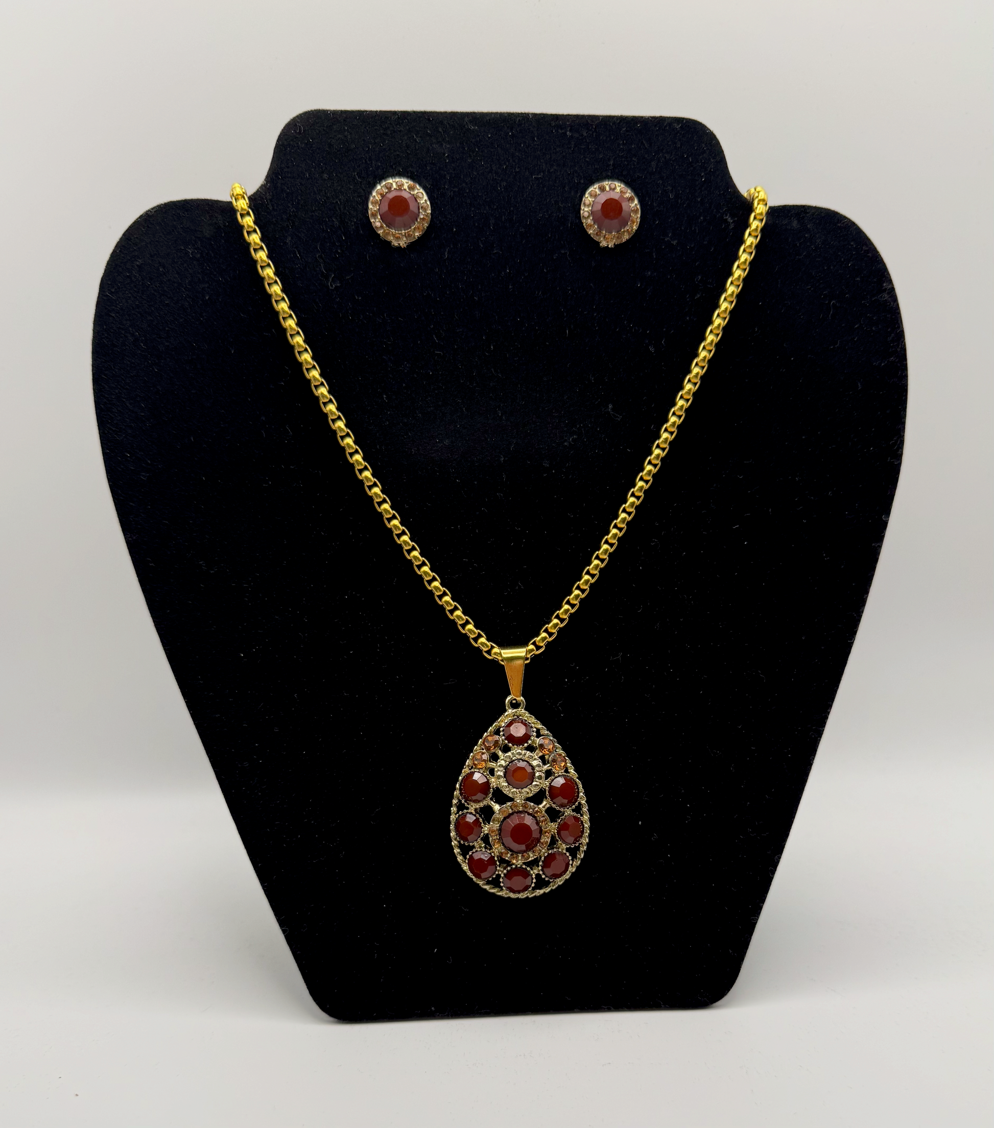 A luxurious gold-toned set featuring a teardrop pendant adorned with deep red gemstones encircled by delicate crystal accents. The matching stud earrings mirror the pendant’s elegance, creating a timeless and regal ensemble perfect for formal occasions.