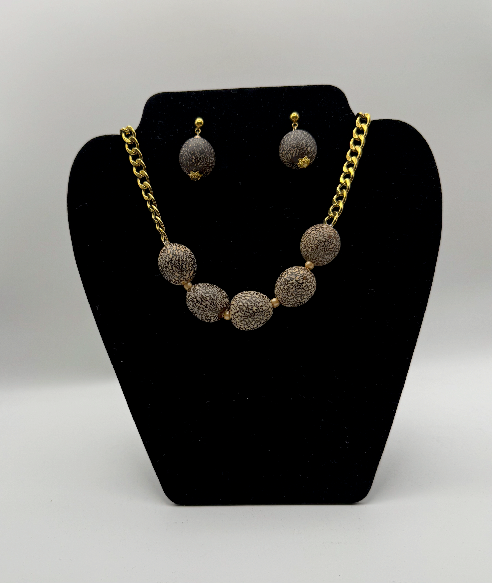 Matte walnut-toned beads with intricate texture rest on a bold gold chain, striking a balance between modern style and natural warmth. Coordinating drop earrings complete the set — ideal for statement wear or casual sophistication.